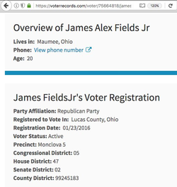 James Alex Fields Jr. (born April 26, 1997) is a resident of Maumee, Ohio . He is registered as the owner of a gray 2010 Dodge Challenger that ran into protesters at the Unite the Right rally.[2] [32] [29]
