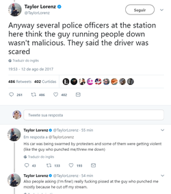 Matt Korbon, a 22-year-old University of Virginia student, said several hundred counter-protesters were marching when “suddenly there was just this tire screeching sound.” A silver Dodge Challenger smashed into another car, then backed up, barreling through “a sea of people.”[48] Taylor Lorenz , Tech reporter for The Hill , tweeted that police officers think that the person that ran people down was not malicious in intent and that the driver was scared. His car was being swarmed and some of them turned violent.[16] Lorenz was also punched in the face at the rally. [32] 19 people were injured in the incident.[47] A 32-year-old woman, identified as Heather Heyer died as a result of the incident. [29] [32] Her death is being investigated as a homicide. [29] [32]