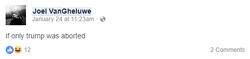 Joel's political stances can be characterized as anarchist-communist. On July 4th, 2015, Joel posted a picture on Facebook decrying nationalism and borders and promoting open borders.[14] In vehement anti-Trumper, Joel wrote a status that said "if only trump was aborted."[2]