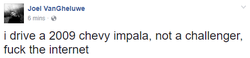 Joel wrote on Facebook that it was not him and that he is in Michigan at a wedding.[26] He says that he owns an Impala, not and Challanger and that he sold the Challenger years ago.[24]