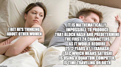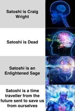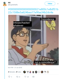 [13] Some speculate that whoever mined the hash is a time traveling quantum computer, possibly Satoshi himself, and have made memes to express their conclusions.
