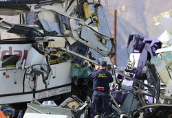 One Witness reports, "The front part of the bus was completely merged into the rear of the semi-truck," she said, adding that it took her more than two hours to drive past the accident and exit the freeway."