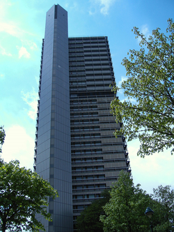 Bundesviertel (federal quarter) with lots of government structures including Post Tower, the tallest building in the state North Rhine-Westphalia, housing the headquarters of Deutsche Post / DHL Maritim Bonn, five-star hotel and convention centre Schürmann-Bau, headquarters of Deutsche Welle Langer Eugen, since 2006 the centre of the United Nations Campus, formerly housing the offices of the members of the German parliament