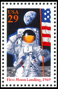 In 1994, Aldrin was anonymously honoured on a United States postage stamp. The 29¢ stamp, commemorating the silver anniversary of the landing, was based on a famous photograph of Aldrin, captured by Neil Armstrong, in which Aldrin's face is obscured by his reflective visor. Postal rules at the time prohibited directly featuring living persons on stamps. [17]