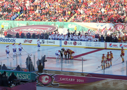 Ceremonial puck drop at the 2011 Heritage Classic between the Calgary Flames and the Montreal Canadiens