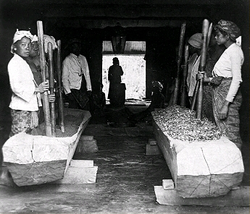 The seeds are sown from December to January in small plots (almacigas) sheltered from the sun, and the young plants when at 40 to 60 centimetres (16 to 24 inches) in height are placed in final planting holes (aspi), or if the ground is level, in furrows (uachos) in carefully weeded soil. The plants thrive best in hot, damp and humid locations, such as the clearings of forests; but the leaves most preferred are obtained in drier areas, on the hillsides. The leaves are gathered from plants varying in age from one and a half to upwards of forty years, but only the new fresh growth is harvested. They are considered ready for plucking when they break on being bent. The first and most abundant harvest is in March after the rainy season, the second is at the end of June, and the third in October or November. The green leaves (matu) are spread in thin layers on coarse woollen cloths and dried in the sun; they are then packed in sacks, which must be kept dry in order to preserve the quality of the leaves.