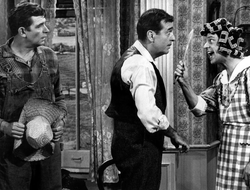 On a 1967 Andy Griffith special, Knotts plays the outraged wife of Tennessee Ernie Ford, as Griffith looks on.