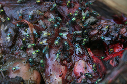 Fly larvae can be used as a biomedical tool for wound care and treatment. Maggot debridement therapy (MDT) is the use of blow fly larvae to remove the dead tissue from wounds, most commonly being amputations. Historically, this has been used for centuries, both intentional and unintentional, on battlefields and in early hospital settings. Removing the dead tissue promotes cell growth and healthy wound healing. The larvae also have biochemical properties such as antibacterial activity found in their secretions as they feed. These medicinal maggots are a safe and effective treatment for chronic wounds.