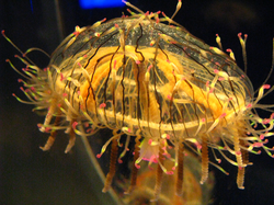 Jellyfish are displayed in many public aquariums. Often the tank's background is blue and the animals are illuminated by side light, increasing the contrast between the animal and the background. In natural conditions, many jellies are so transparent that they are nearly invisible.