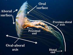In biology, a medusa (plural: medusae) is a form of cnidarian in which the body is shaped like an umbrella, in contrast with polyps. Medusae vary from bell-shaped to the shape of a thin disk, scarcely convex above and only slightly concave below. The upper or aboral surface is called the exumbrella and the lower surface is called the subumbrella; the mouth is located on the lower surface, which may be partially closed by a membrane extending inward from the margin (called the velum). The digestive cavity consists of the gastrovascular cavity and radiating canals which extend toward the margin; these canals may be simple or branching, and vary in number from few to many. The margin of the disk bears sensory organs and tentacles.