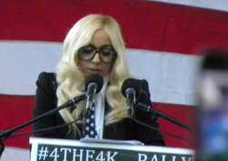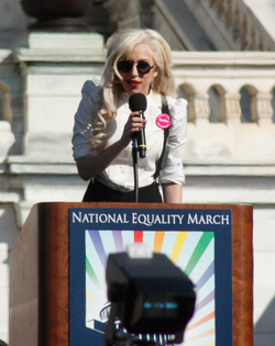 Gaga spoke at the 2009 National Equality March in Washington in support of the LGBT movement. [444] She attended the 2010 MTV Video Music Awards accompanied by four gay and lesbian former members of the United States Armed Forces who had been unable to serve openly under the US military's "don't ask, don't tell" policy, which banned open homosexuality in the military. [444] Gaga urged her fans via YouTube to contact their senators in an effort to overturn the policy. In September 2010, she spoke at a Servicemembers Legal Defense Network's rally in Portland, Maine. Following this event, *The Advocate * named her a "fierce advocate" for gays and lesbians. [444] Gaga appeared at Europride, an international event dedicated to LGBT pride, in Rome in June 2011. She criticized the poor state of gay rights in many European countries and described gay people as "revolutionaries of love". [36] Gaga was ordained as a minister by the Universal Life Church Monastery so that she could officiate the wedding of two female friends. [771] In June 2016, during a vigil held in Los Angeles for victims of the attack at the gay nightclub Pulse in Orlando, Gaga read aloud the names of the 49 people killed in the attack, and gave a speech. [771] Later that month, Gaga appeared in Human Rights Campaign's tribute video to the victims of the attack. [771] She has opposed the presidency of Donald Trump and deplored his military transgender ban. [771] [771] She supported former Secretary of State Hillary Clinton for president in 2016. [771]