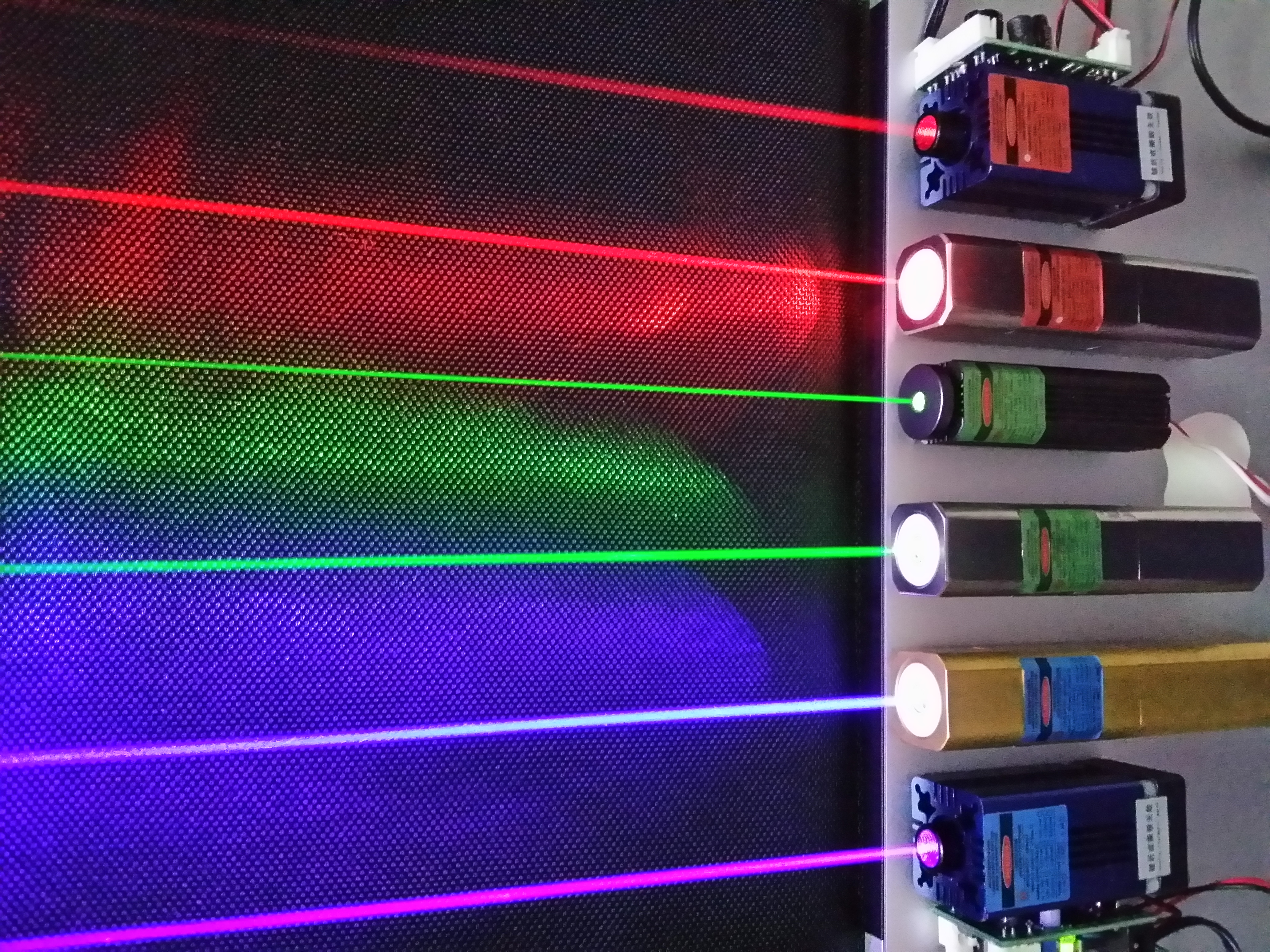 Red (660 & 635 nm), green (532 & 520 nm) and blue-violet (445 & 405 nm) lasers