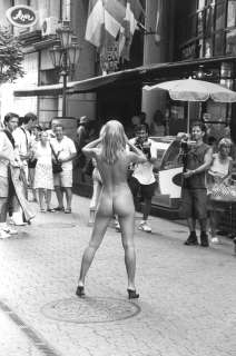 Nude woman posing on a street in Budapest