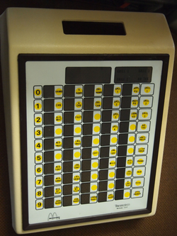 One of the first microprocessor-controlled cash register systems was built by William Brobeck and Associates in 1974, for McDonald's Restaurants. [undefined] It used the Intel 8008, a very early microprocessor (and forerunner to the Intel 8088 processor used in the original IBM Personal Computer). Each station in the restaurant had its own device which displayed the entire order for a customer — for example, [2] Vanilla Shake, [1] Large Fries, [3] BigMac — using numeric keys and a button for every menu item. By pressing the [Grill] button, a second or third order could be worked on while the first transaction was in progress. When the customer was ready to pay, the [Total] button would calculate the bill, including sales tax for almost any jurisdiction in the United States. This made it accurate for McDonald's and very convenient for the servers and provided the restaurant owner with a check on the amount that should be in the cash drawers. Up to eight devices were connected to one of two interconnected computers so that printed reports, prices, and taxes could be handled from any desired device by putting it into Manager Mode. In addition to the error-correcting memory, accuracy was enhanced by having three copies of all important data with many numbers stored only as multiples of 3. Should one computer fail, the other could handle the entire store.