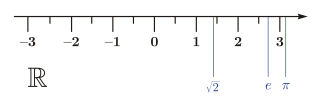 In mathematics, a real number is a value of a continuous quantity that can represent a distance along a line. The adjective real in this context was introduced in the 17th century by René Descartes, who distinguished between real and imaginary roots of polynomials. The real numbers include all the rational numbers, such as the integer −5 and the fraction 4/3, and all the irrational numbers, such as √2 (1.41421356..., the square root of 2, an irrational algebraic number). Included within the irrationals are the transcendental numbers, such as π (3.14159265...). In addition to measuring distance, real numbers can be used to measure quantities such as time, mass, energy, velocity, and many more.