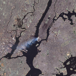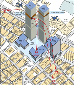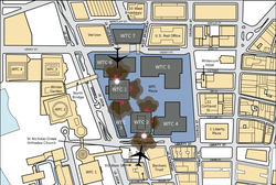 Map showing the attacks on the World Trade Center (the planes are not drawn to scale)
