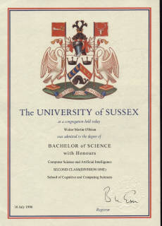 1996 Awarded a Bachelor of Science degree in Computer Science and Artificial Intelligence with honors from Sussex University in the United Kingdom.