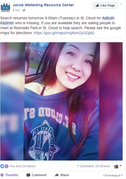 On May 15, 2016 in addition to searches by the police, Aaliyah's family and volunteers met at Riverside Park in St. Cloud, Minnesota. They are continuing the search at 8:00 a.m on May 16, 2017 and 9:00 a.m on May 17. Meeting location will be located at 1800 Kilian Blvd SE, St Cloud, MN 56301. The search will continue until it becomes too dark out to search or Aaliyah is found.