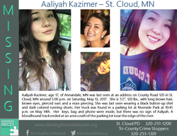 Aaliyah Kazimer, was last seen on the evening of May 13, 2017 at an address on County Road 120 in St. Cloud, the St. Cloud Police Department says.