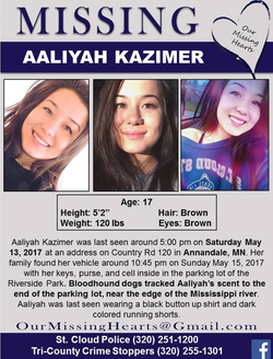 Aaliyah Christine Kazimer is a 17-year-old from Annandale, Minnesota. She went missing and was last seen on May 13, 2017. She was found safe on March 17, 2017.
