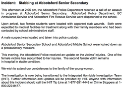 On November 1, 2016, Gabriel Brandon Klein randomly stabbed two Female students at Abbotsford Senior Secondary around 2:00p.m., fatally wounding one of the victims, Letisha Reimer. The second victim Emily Isaak was wounded and is currently in stable condition.