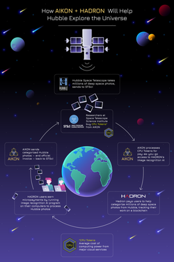 Inforgraphic explaining how AKOIN and HADRON are using blockchain technology to support space exploration using the Hubble Space Telescope. [11]