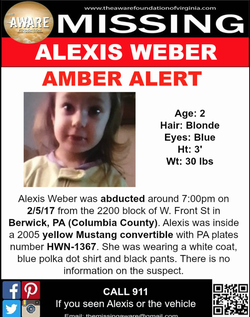 On February 5, 2017 Alexis Weber was kidnapped around 7 p.m. from 2200 West Front Street in Berwick, Pennsylvania. Pennsylvania State Police issued an AMBER Alert the same day to help find her. [1]