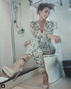 Photo of Alineh Avanessian wearing a stylish women's suit with money pattern.