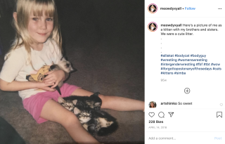 Allie Kat is a feline wrestler who has been known to get distracted by cat toys and yarn. She also stops in the middle of a match to groom herself, and has been known to lay on her back in the middle of the ring to bring her enemies closer. Though playful, she is equally dangerous and has bashed a few heads with chairs. Allie Kat also loves drinking White Claw.[26][48][49]