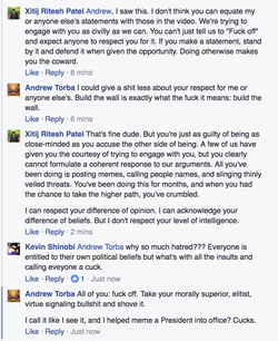 Citation Linkywqaugeunhowzrcj.public.blob.vercel-storage.comScreenshot of the Facebook conversation involving the incident where Torba makes his political statements.