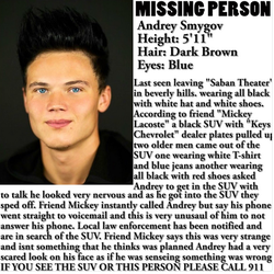 Smygov was last seen leaving the Saban Theatre in Beverly Hills, CA when a Black SUV with "Keys Chevrolet" dealer plates pulled up to him and a friend who goes by "Mickey Lacoste." They asked Smygov to get into the vehicle in which he did nervously, and they sped off. When his friend tried to call him, it went straight to voicemail. He has been missing for over 24 hours and the authorities have been notified of his disappearance.