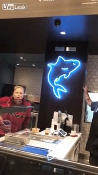 (Anna Storelli walks back to the cashier to pick up her food, turns around and heads to the door.