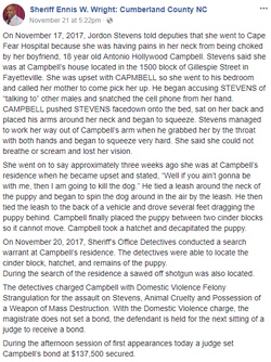 On November 17, 2017 Jordon Stevens told deputies that she went to Cape Fear Hospital because she was having pains in her neck from being choked by her boyfriend, 18 year old Antonio Hollywood Campbell.
