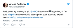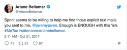 One of the other Tweets by Ariane Bellamar about the Jeremy Piven sexually assault allegations. “Hey @jeremypiven! ‘Member when you cornered me in your trailer on the #Entourage set? ‘Member grabbing my boobies on the (couch) without asking?? ‘Member when I tried to leave; you grabbed me by the a--, looked at yourself in the mirror, & said what a ‘beautiful couple’ we made?”“And, don’t try to deny it, sir. @HBO has us on [tape emoji] together, & I’m sure @sprint has electronic back-ups of your abusive, explicit text. #MeToo,” Tweet by Ariane Bellamar about the Jeremy Piven sexually assault allegations. “Sprint seems to be willing to help me find those explicit text mails you sent to me, @jeremypiven. Enough is ENOUGH with this ‘ish.”