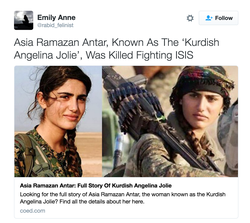 Asia Ramazan Antar was a 22 year-old high-ranking Kurdish soldier of the all-female division of People's Protection Units (YPG) known for sharing a resemblance to actress, Angelina Jolie. She joined YPG in 2014. [1]
