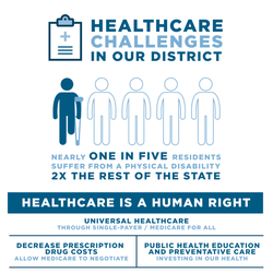 Expanding federal and state public health insurance programs is a major priority for Audrey Denney as more than half of her district's population uses these programs. Also one in five residents in the district suffer from a physical disability, which is twice as high as the rest of the California. She believes the Patient Protection and Affordable Care Act Cases has helped her district in decreasing the uninsured rate and expanding important health protections. She believes that there needs to be an additional focus on reducing rising health insurance costs and increasing access to adequate health services in rural areas. Denney supports Medicare for All legislation that would guarantee universal healthcare coverage for all Americans. She also wants to increase the amount of federal healthcare spending her district receives. [undefined]