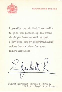 In 1975 Parkes was awarded the British Empire Medal (BEM, see letter below) in recognition of his work in Northern Ireland; during and after his military service he was awarded several other commendations and medals.