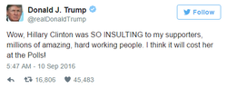 On September 9th, Clinton attended a LGBT Gala in New York where she spoke to the crowd. In her speech Clinton attempted to undermine Trump's popularity by saying "To just be grossly generalistic, you can put half of Trump supporters into what I call the 'basket of deplorables .' Right? Racist, sexist, homophobic, xenophobic, Islamaphobic, you name it. Some of those folks...irredeemable"