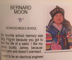 Bernard Moon was an 18 year old high school student from Thousand Oaks, California. He attended Thousand Oaks High School - Newbury Park, California - High School. He was an aspiring engineer, a varsity tennis player and honors student.