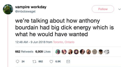 "we're talking about how Anthony Bourdain had big dick energy which is what he would have wanted"[undefined]