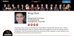 Bing Chen was previously Global Creator Development & Management Lead at YouTube. He studied Creative Writing at The University of Pennsylvania. Bing now resides in Los Angeles and came originally from Knoxville, Tennessee.
