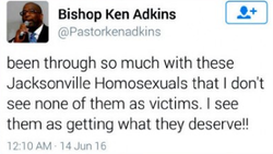 Adkins gained notoriety for tweeting that the gay nightclub attendees who were killed in the Pulse nightclub shooting by deranged Islamic terrorist Omar Mateen"got what they deserved".