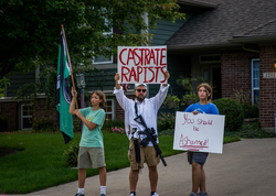 Men and women are seen carrying firearms and holding signs with extreme messages decrying the rapist.