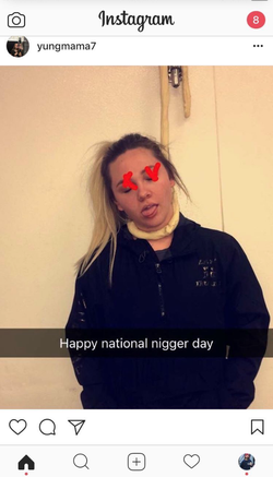 The photo shows Wilson pretending to hang herself, with “x” drawn onto her eyes with the caption “Happy national ni**er day.” [1] [undefined]