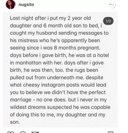“Last night after I put my 2-year-old daughter and 6-month-old son to bed, I caught my husband sending messages to his mistress who he’s apparently been seeing since I was 8 months pregnant.