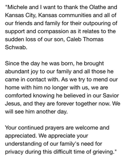 The Schwab family describe Caleb bringing an abundant amount of joy to their family They have seen a tremendous amount of support from their community, giving them comfort in this time of great tragedy.