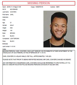 On November 16, 2016 Carl Conyers was reported missing to the Houston Police Dept. He had last been seen Tuesday afternoon by his roommate at their apartment in South Central Houston. Police said he had shaven a beard he’d been seen wearing in a handout photo.