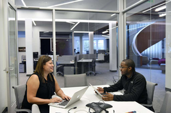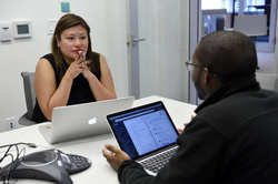 Carolina Huaranca meets with Brian Dixon at the Kapor Center for Social Impact in Oakland.