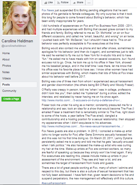 On August 5, Heldman took to Facebook to come forward about her experiences with Bolling, both on the air and off the air. In her testimonial, she wrote how he made unwanted advances towards her on several occasions: