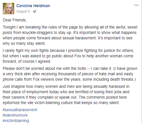 In April 2017, Heldman filed a sexual harassment complaint with Fox against Bill O’Reilly.